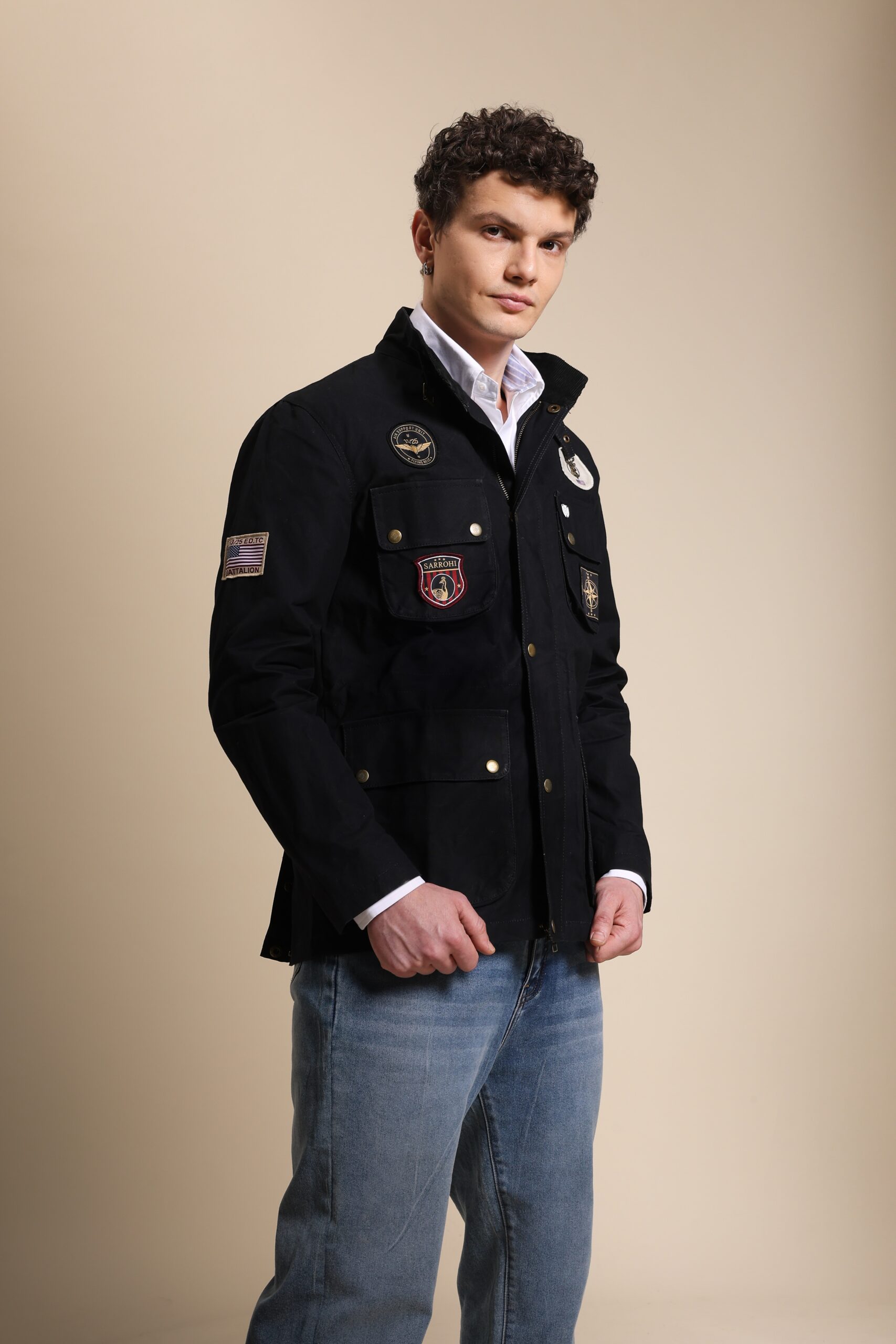 Black waxed jacket with four pockets.