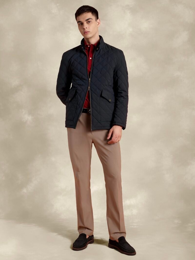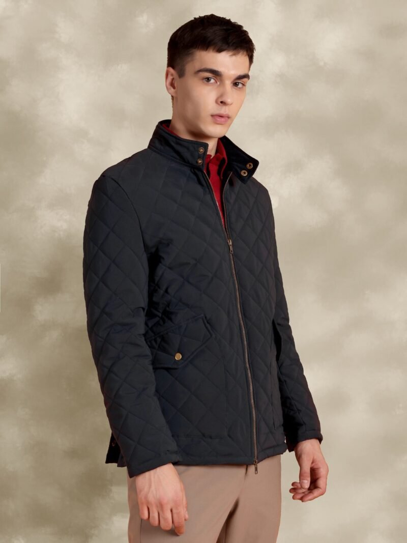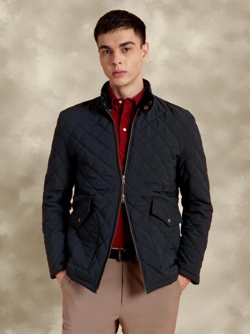 Tagore Jacket- Blue Slim Fit Quilted Jacket With Corduroy Collars