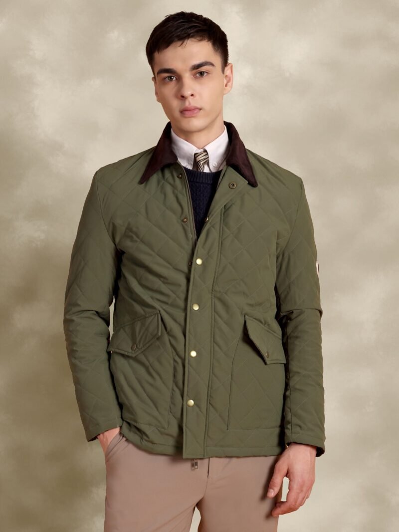 Tagore Jacket- Olive Green Slim Fit Quilted Jacket With Corduroy Collars